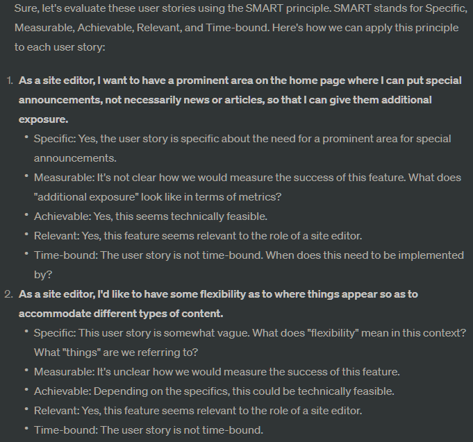 ChatGPT will respond to any prompt. But to get the best output, we need to give it a proper context. For example, if we prompt it to act as a Scrum Master, it will now have the contextual information to guide its responses.