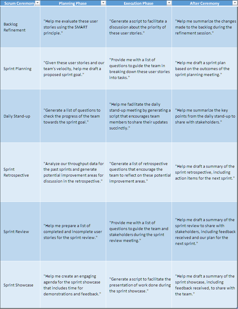 I’ve used the example of Scrum ceremonies and then created some prompts for pre, during and post phases of the ceremony. Here are the prompts in the image below: