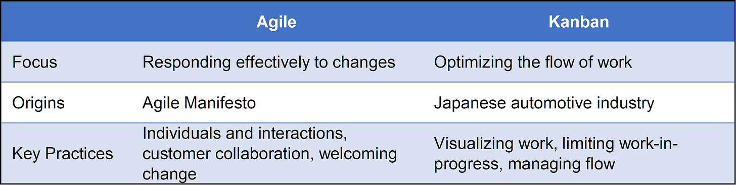 As you can see, while both Agile and Kanban aim to improve the way we work, they do so in different ways.
